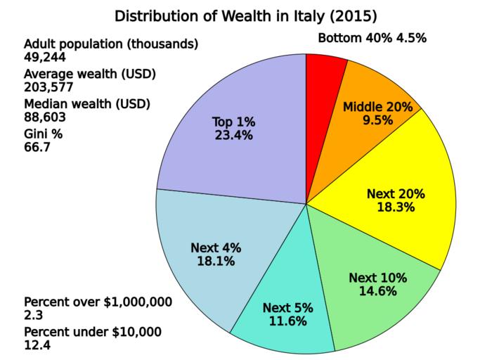 Keywords: Distribution of Wealth in Italy.svg translate yes en Wealth shares of different percentile groups in Italy in 2015 Data from Credit Suisse http //publications credit-suisse com/tasks/render/file/index cfm fileid C26E3824-E868-56E0-CCA04D4BB9B9ADD5 Table 6-5 Page 149 2016-07-20 own Delphi234 other versions cc-zero Distribution of wealth Economic inequality SVG pie charts |