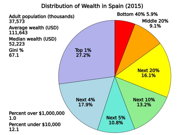 Keywords: Distribution of Wealth in Spain.svg translate yes en Wealth shares of different percentile groups in Spain in 2015 Data from Credit Suisse http //publications credit-suisse com/tasks/render/file/index cfm fileid C26E3824-E868-56E0-CCA04D4BB9B9ADD5 Table 6-5 Page 149 2016-07-20 own Delphi234 other versions cc-zero Distribution of wealth Economic inequality SVG pie charts |