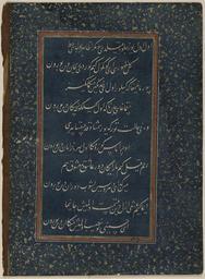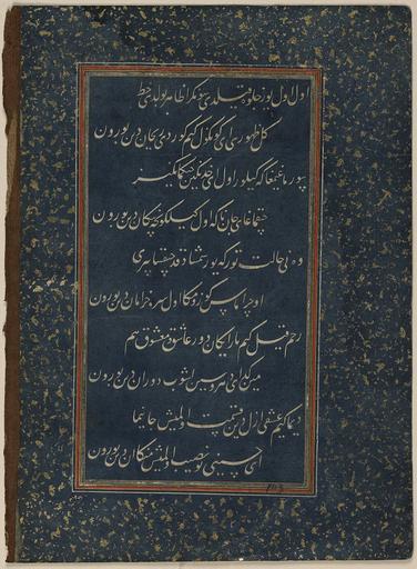 | Keywords: Divan of Sultan Husayn Mirza WDL6802.png Artwork ru Хусейн Байка а Султан Хо асана 1438-1506 fr Ḥusayn Bāyqarā Sultan de Khorassan 1438-1506 en Ḥusayn Bāyqarā Sultan of Khorasan 1438-1506 zh 侯赛因·巴 拉̄ 呼罗珊苏丹 1438-1506 pt Ḥusayn Bāyqarā Sultão de Khorasan 1438-1506 ar حسين بيقرة سلطان خراسان 1438-1506 es Ḥusayn Bāyqarā Sultán de Khorasan 1438-1506 ru Диван султана Хусейна и зы fr Divan du sultan Husayn Mirza en Divan of Sultan Husayn Mirza zh 苏丹侯赛因·米尔扎的诗集 pt Divã do Sultão Husayn Mirza ar ديوان السلطان حسين ميرزا ru Данный лист соде жит десять поэтических ст ок из дивана сбо ника стихотво ений составленного на тю кском чагатайском языке последним п авителем из династии Тиму идов султаном Хусейном и зой 1438 1506 гг Выполненный письмом насталик в технике декупаж этот ф агмент относится к ныне аз озненной укописи каллиг афия кото ой возможно была выполнена султаном Али аль- ашхади п име но в 1490 г Султан Хусейн и за ибн ансу ибн Байка а был п авителем Хо асана со столицей в Ге ате на те ито ии сов еменного Афганистана с 1469 г до своей сме ти в 1506 г Го од был важным культу ным цент ом кото ый п ивлекал не только тю кских и пе сидских поэтов но и исто иков художников и каллиг афов Сам п авитель был авто ом поэтических п оизведений тво ившим под псевдонимом Хусайни и его стихи на тю кском чагатайском языке <em>газели</em> в азме е <em> амаль</em> составили сбо ник названный <em> Divan-i Husayni </em> Диван Хусайни а этом листе буквы не написаны че нилами а искусно вы езаны из синей бумаги и затем наклеены на подложку к емового цвета об амленную полями ук ашенными золотыми вк аплениями на синем фоне Техника декупаж известна под названием <em>qit'a</em> что в буквальном пе еводе означает вы езание а художников аботавших в этой технике называли <em>qati'an</em> езальщики Каллиг афия в технике декупаж получила ши окое асп ост анение в последней четве ти 15-го века как указано в т актате Кади Ахмада на эту тему написанном в 1015 г хидж ы 1606 г н э <br>А абская каллиг афия; Иллюмини ование укописей; Исламская каллиг афия; Исламские укописи; Ту ецкая поэзия fr Ce feuillet comporte dix lignes de poésie extraite d'un divan recueil de poèmes écrit en turc tchagataï par le dernier souverain timouride le sultan Husayn Mirza 1438 1506 Rédigé en écriture nasta'liq par un processus de découpage ce fragment fait partie d'un manuscrit aujourd'hui dispersé peut-être calligraphié par le sultan 'Ali al-Mashhadi vers 1490 Le sultan Husayn Mirza b Mansur b Bayqara souverain du Khorrasan vécut à Hérat capitale du pays aujourd'hui en Afghanistan de 1469 à sa mort en 1506 La ville était un centre culturel important attirant à la fois des poètes turcs et persans ainsi que des historiens des artistes et des calligraphes Le souverain lui-même écrivait de la poésie sous le nom de plume d'Husayni et ses poèmes en turc tchagataï <em>ghazals</em> en mètre <em>ramal</em> furent réunis dans un recueil appelé le <em>divan-i Husayni</em> Les lettres de ce feuillet ne sont pas écrites à l'encre mais ont été découpées très adroitement à partir d'un papier bleu et collées sur un fond de couleur crème dont les marges sont pourvues d'un cadre décoré d'un saupoudrage d'or sur fond bleu Cette technique de découpage est connue sous le nom de <em>qit'a</em> un terme signifiant littéralement <em>découpe</em> et les artistes spécialisés dans cette technique étaient appelés les <em>qati'an</em> coupeurs La calligraphie en découpage devint populaire vers le dernier quart du XV<sup>e</sup> siècle comme le montre clairement le traité de Qadi Ahmad de 1015 A H 1606 apr J -C sur le sujet <br>Calligraphie arabe; Enluminures; Calligraphie islamique; Manuscrits islamiques; Poésie turque en This folio includes ten lines of poetry from a divan compendium of poems written in Chagatay Turkish by the last Timurid ruler Sultan Husayn Mirza 1438 1506 Executed in nasta'liq script through a process of découpage the fragment belongs to a now dispersed manuscript possibly calligraphed by Sultan 'Ali al-Mashhadi around 1490 Sultan Husayn Mirza b Mansur b Bayqara was ruler of Khurasan based in its capital city of Herat present-day Afghanistan from 1469 to his death in 1506 The city was an important cultural center attracting both Turkish and Persian poets as well as historians artists and calligraphers The ruler himself composed poetry using the pen name Husayni and his Chagatay Turkish poems <em>ghazals</em> in <em>ramal </em>meter were compiled in a collection called the <em>Divan-i Husayni</em> This folio s letters are not written in ink but have been cut out very skillfully from a blue pap