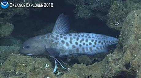 Keywords: okeanos explorer okeanosexplorer noaa exploration ocean jellynose eel jellynoseeel credit: National Oceanic and Atmospheric Administration (NOAA) Dive 18: Esmerelda Bank, 08 May 2016 ROV Deep Discoverer has been deployed for Dive 18 on Esmerelda Bank. Today’s dive will start ~600m to explore for deep-sea coral communities (especially precious corals), and transit upslope to also survey bottomfish fishery habitat (starting at ~400m) up to ~250m. oceanexplorer.noaa.gov/okeanos/welcome.html While making observations at a depth of about 330 meters, one of the scientists excitely broke in and identified this as a type of Jellynose eel (genus guentherus, species katoi) which was first described as a new species in 2008, and said that this is only the second observation of a live specimen. This one looked to be about 40cm long. I see that someone has already uploaded a video: youtu.be/9Q_yiYKonQo credit: National Oceanic and Atmospheric Administration (NOAA) Dive 18: Esmerelda Bank, 08 May 2016 ROV Deep Discoverer has been deployed for Dive 18 on Esmerelda Bank. Today’s dive will start ~600m to explore for deep-sea coral communities (especially precious corals), and transit upslope to also survey bottomfish fishery habitat (starting at ~400m) up to ~250m. oceanexplorer.noaa.gov/okeanos/welcome.html While making observations at a depth of about 330 meters, one of the scientists excitely broke in and identified this as a type of Jellynose eel (genus guentherus, species katoi) which was first described as a new species in 2008, and said that this is only the second observation of a live specimen. This one looked to be about 40cm long. I see that someone has already uploaded a video: youtu.be/9Q_yiYKonQo |