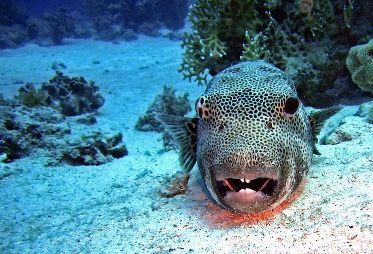Keywords: diving underwater water fish puffer fish coral sand sea blue maritime underwater world