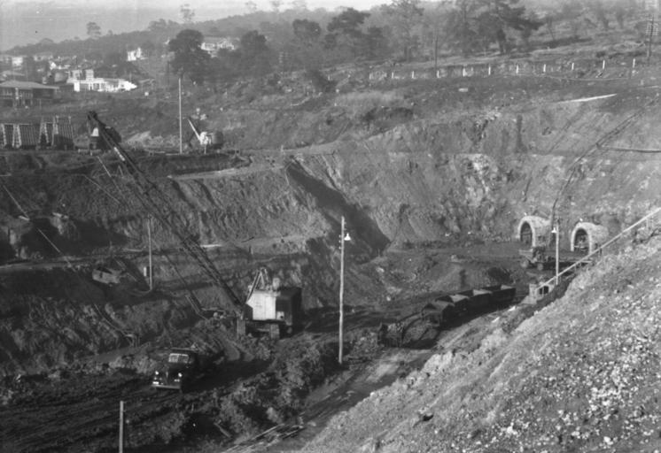 Keywords: power station hydro electric commision tasmania trevallyn launceston blackandwhite monochrome outdoor vehicle train locomotive black and white Trevallyn power station construction, circa 1953 David Lidster collection Trevallyn power station construction, circa 1953 David Lidster collection |