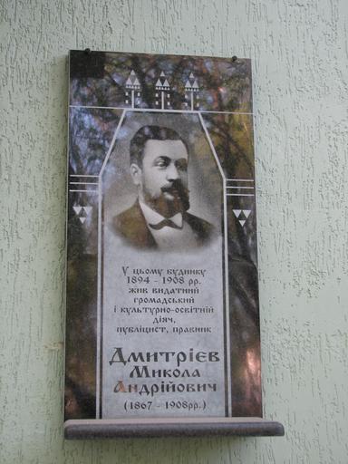 Keywords: Dmytriev.JPG uk В цьому будинку 1894-1908 жив А Дмит ієв own Tuma26 Commemorative plaques in Poltava 3 Constitution Street Poltava