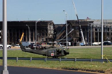 | Keywords: DN-SD-03-17505.JPEG A United States UH-1H Iroquois Huey Army medical helicopter standing by in the event that injured survivors are found among the charred debris inside the Pentagon on September 12 2001 The morning before in an attempt to frighten the American people five members of Al-Qaida a terrorist group of fundamentalist Muslims hijacked American Airlines Flight 77 then flew a circuitous route returning to Washington and impacting the Pentagon killing all 64 passengers onboard and 125 people on the ground The impact destroyed or damaged four of the five rings in that section of the building Firefighters fought the fire through the night http //www dodmedia osd mil/Assets/Still/2003/Navy/DN-SD-03-17504 JPEG 2001-09-12 PH1 MICHAEL PENDERGRASS USN PD-USGov-Military-Navy The Pentagon on 12 September 2001 September 2001 photographs Bell UH-1 Iroquois Photographs by Michael W Pendergrass |