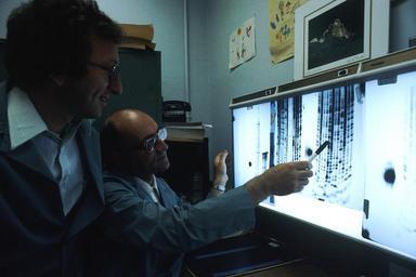 Keywords: DNA sequencing.jpg Two male scientists wearing lab coats in a laboratory looking at a highlighted light board reading the genetic code in the DNA Topics/Categories People -- Adult People -- Health Professional Science and Technology -- Genetics Type Color Photo Source National Cancer Institute Linda Bartlett Photographer 2018 1980 Reuse Restrictions None - This image is in the public domain and can be freely reused Please credit the source and/or author listed above Linda Bartlett Photographer PD-USGov-HHS-NIH Media from National Cancer Institute Visuals Online Images uploaded by Fæ |