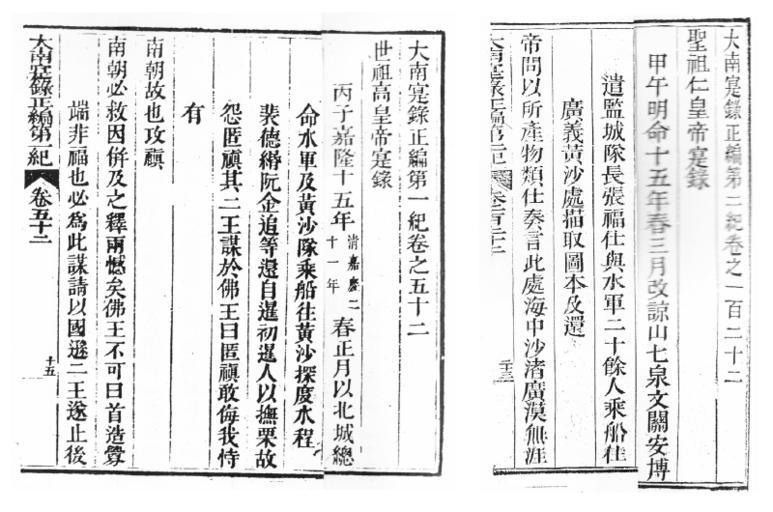 Keywords: DNTL-HoangSa.png vi Hai trang sách Đại Nam Thực lục Chính biên 大南實錄 bằng chữ Hán do Quốc sử quán triều Nguyễn biên soạn viết về việc Nhà Nguyễn Việt Nam chính thức xác lập chủ quyền trên quần đảo Hoàng Sa với tư cách là một quốc gia gồm 01 trang ở Đệ nhất kỷ quyển 52 và 01 trang ở Đệ nhị kỷ quyển 122 http //www viethoc org/eholdings/HoangSa_TruongSa_HoBachThao_02 pdf Quốc sử quán triều Nguyễn 1820 1890 PD-old Paracel Islands |