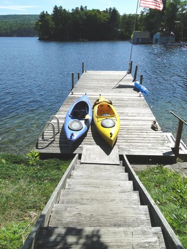 Keywords: dock summer vacation kayaks lake lake shore sunshine sunny empty water wooden outdoors recreation recreational day daytime stairs steps warm