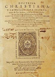 | Keywords: Doctrina Christiana.jpg en Title page of the Doctrina christiana y catecismo para instruccion de los Indios the first book printed in South America in Lima 1585 by Antonio Ricardo 2011-06-21 http //www library upenn edu/exhibits/rbm/kislak/religion/lima1 html Anonymous printed by Antonio Ricardo PD-old-100 Uploaded with UploadWizard Title pages Early printed books Antonio Ricardo 1585 books Books from Peru Quechuan languages Aymara | ||||