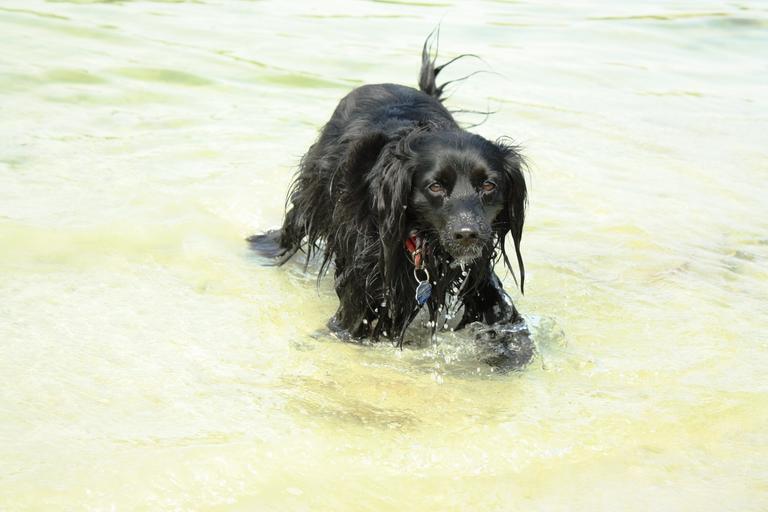Keywords: dog animal sight coat snout gear joy lake water happiness swimming aport black spaniel