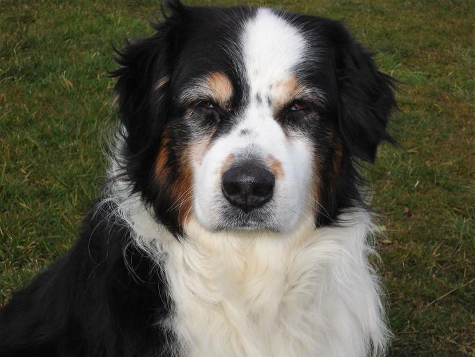Keywords: dog australia shepard black white brown older grizzled eyes