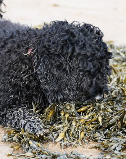 Keywords: dog beach holiday seaweed playing vacation shore beach fun dog playing happy dog nature pet