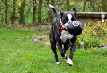 Keywords: dog boxer pet black and white play ball run animal romp race awakened