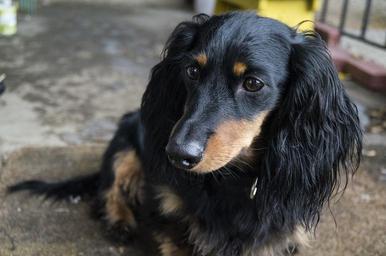 Keywords: dog dachshund pet animal puppy canine purebred domestic cute furry pup companion adorable friend playful sitting doggy staring wiener dog hound