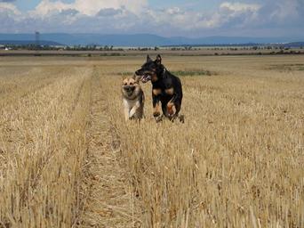 Keywords: dog dogs animal summer outdoors nature rottweiler shepherd grain sky landscape field