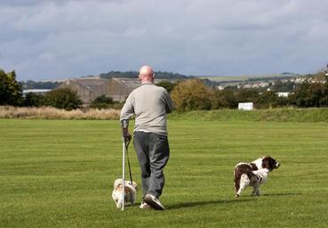 Keywords: dog dogs walker man person dog walker spaniel shih tzu disabled crutch crutches stick green grass countryside nature walking exercise animal animals canine pet