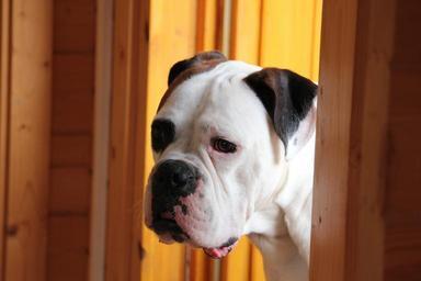 Keywords: dog door snout input entrance door wait animal boxer dog look