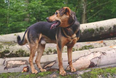 Keywords: dog hybrid hundeportrait wildlife photography male log attention mixed breed dog schäfer dog appenzell senne dog stand standing forest pet friend obedience good