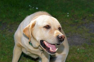 Keywords: dog labrador male pet white close head animal snout fur laughing view friendly dear
