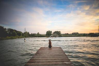 Keywords: dog pet wooden pier lake river wild water swim outdoors landscape nature explore seasons scenic earth relax relaxation wander live calm serene peaceful tranquil young
