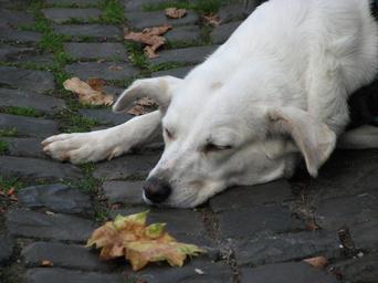Keywords: dog rest cobblestones leaf sleep tired relax relaxation white animal fur concerns recover sleepy recovery exhausted doze break