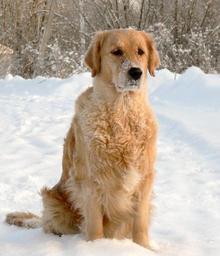 Keywords: dog snow golden retriever sitting portrait winter canine attentive domestic pet obedient