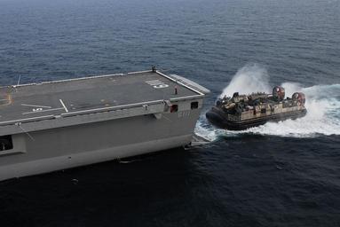 Keywords: Dokdo LCAC.jpg en 071115-N-0237L-103 SEA OF JAPAN Nov 11 2007 Republic of Korea ROK amphibious assault ship ROKS Dokdo LPH 6111 conducts well deck operations with a U S landing craft air cushion from the Dragons of Assault Craft Unit ACU 5 Det Western Pacific embarked aboard the amphibious assault ship USS Essex LHD 2 U S and ROK forces are currently involved in the Korean Interoperability Training Program to increase U S /Korean bilateral amphibious operational readiness Essex is the lead ship of the only forward-deployed U S Expeditionary Strike Group and serves as the flagship for CTF 76 the Navy's only forward-deployed amphibious force commander Task Force 76 is headquartered at White Beach Naval Facility Okinawa Japan with a detachment in Sasebo Japan fr Un LCAC de l'US Navy s'enradie dans le Dokdo LPH 6111 de la Marine sud-coréenne en mer du Japon 071115-N-0237L-103 Navy http //www navy mil/view_image asp id 52814 U S Navy photo by Mass Communication Specialist 3rd Class AW Christian Lemus 2007-11-11 PD-USGov-Military-Navy ROKS Dokdo LPH 6111 LCAC-58 ship 1993 Assault Craft Unit 5 Watercraft in motion |
