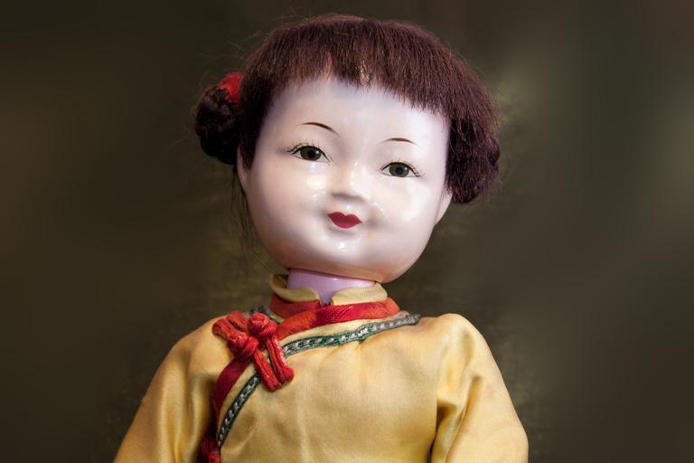 Keywords: doll japan japanese old toys face kimono yellow red hand painted