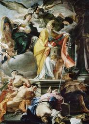 Keywords: Domenico Antonio Vaccaro - Allegory of the Papacy of Clement XI - Walters 371897.jpg Walters Art Museum artwork Creator Domenico Antonio Vaccaro In this allegory various symbolic motifs are brought together to express Clement XI's papacy r 1700-1721 as an abstract concept The standing woman at center wearing the papal tiara is holding her cape in a protective manner over a little temple supported by angels She may by an allegory of Religion protecting the Roman Church To the base on which she stands like a column are chained different agonized figures symbolizing vices an allusion to Protestants and Muslims Above Fame blows her horn while pointing to a portrait of the pontiff The allegory as a whole is a portrait or a mirror of the pope and his virtues Zeri Italian paintings in the Walters Art Gallery 432 544-545 ca 1720 Baroque oil on copper Painted surface cm 70 4 52 2 accession number 37 1897 32623 Don Marcello Massarenti Collection Rome date and mode of acquisition unknown 1881 catalogue no 96 as Tiepolo 1897 catalogue no 355 as Sebastiano Ricci Henry Walters city Baltimore Walters Art Museum Henry Walters Acquired by Henry Walters with the Massarenti Collection 1902 place of origin Naples Italy Walters Art Museum license 2D Baroque paintings in the Walters Art Museum Domenico Antonio Vaccaro Paintings in the Walters Art Museum Media contributed by the Walters Art Museum needs category review |