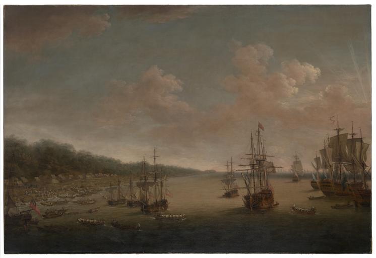 | Keywords: Dominic Serres the Elder - The Capture of Havana, 1762- the Landing, 7th June.jpg A depiction of an episode from the last major operation of the Seven Years War 1756 “63 It was part of England ™s offensive against Spain when she entered the war in support of France late in 1761 The British Government ™s response was immediately to plan large offensive amphibious operations against Spanish overseas possessions particularly Havana the capital of the western dominions and Manila the capital of the eastern Havana needed large forces for its capture and early in 1762 ships and troops were dispatched under Admiral Sir George Pocock and General the Earl of Albemarle The force which descended on Cuba consisted of 22 ships of the line four 50-gun ships three 40-gunners a dozen frigates and a dozen sloops and bomb vessels In addition there were troopships storeships and hospital ships Pocock took this great fleet of about 180 sail through the dangerous Old Bahama Strait from Jamaica to take Havana by surprise Havana on Cuba's north coast was guarded by the elevated Morro Castle which commanded both the entrance to its fine harbour immediately to the west and the town on the west side of the bay This painting shows the encampment of the British troops at Cojimar Bay after landing some six miles east of Morro Castle on 7 June in preparation for the siege To the left are the rows of tents of the British camp with boats moving to and fro between storeships and elements of Pocock's fleet flying blue on the right between 1770 75 Oil canvas cm 127 6 188 6 Institution National Maritime Museum object history credit line On loan to the National Maritime Museum Greenwich London from a private lender accession number BHC0409 http //collections rmg co uk/collections/objects/11901 html Royal Museums Greewich PD-old-100 Dominic Serres Paintings of Battle of Havana Cuba in the 1760s 18th-century paintings of naval battles Paintings in the National Maritime Museum London |