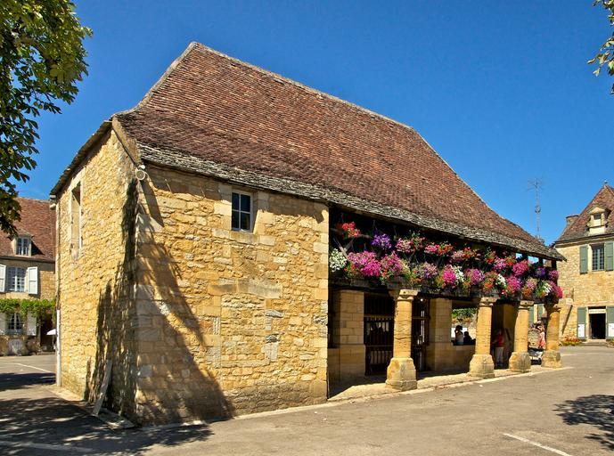 Keywords: domme france market hall building flowers architecture village sky clouds outside
