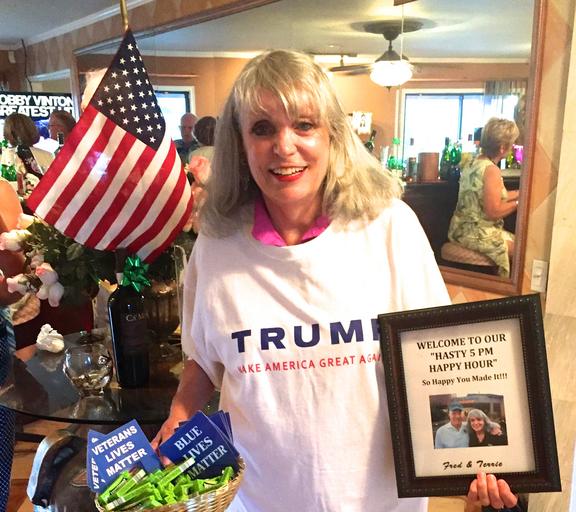 | Keywords: Donald Trump Welcome to a Hasty Happy Hour.jpg en Lifelong Democrat Terrie Frankel in living room holding Welcome to Terrie and Fred's Hasty Happy Hour sign; wearing TRUMP Make America Great Again T-shirt A former USO performer during the Vietnam War and big supporter of our military veterans and police Note Blue Lives Matter bumper stickers in photo 2016-06-24 19 25 18 own TwinsofSedona other versions cc-zero Supporters of the Donald Trump presidential campaign 2016 Donald Trump presidential campaign 2016 Donald J Trump Donald J Trump Fans Terrie Frankel Blue Lives Matter Veterans Lives Matter Make America Great Again |