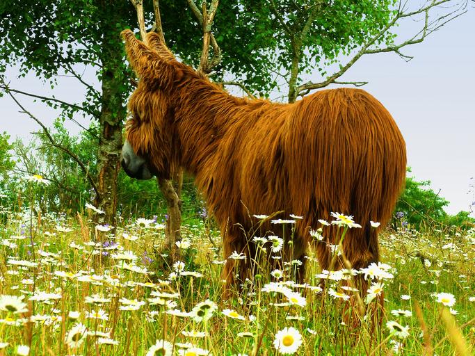 Keywords: donkey long haired fur dog eared creature mammal red-brown zoo livestock meadow flower meadow old breed nature green red brown rural animal animal world mane