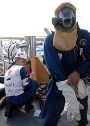 | Keywords: Donning the firefighter gear DVIDS107983.jpg en Petty Officer 2nd Class Tavarish McNair assigned to the Ticonderoga-class guided-missile cruiser USS Lake Erie dons firefighting gear while Petty Officer 3rd Class Michael Mullin examines Coast Guard Fireman Logan Schindler for heat stroke during a tri-lateral search and rescue exercise aboard the U S Coast Guard cutter Kittiwake Kittiwake served as a simulated distressed vessel positioned approximately 20 miles east of Kauai Hawaii The exercise was held to enhance tri-lateral security cooperation between the Navy Coast Guard the Republic of Korea and the Japan Maritime Self-Defense Force military 2008-08-05 Petty Officer 2nd Class Michael Lantron https //www dvidshub net/image/107983 080805-N-+++++-076 2008-08-11 23 53 USCG KITTIWAKE AT SEA PD-USGov-Military-Navy Aboard USS Lake Erie CG-70 Images from DoD uploaded by Fæ |
