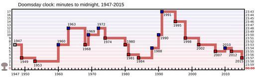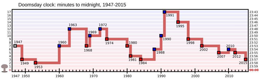 Keywords: Doomsday Clock graph.svg Graph showing the changes in the time of the Doomsday Clock of the Bulletin of the Atomic Scientists Numbers in left column refer to the minutes to midnight nuclear war as the values of the clock are usually expressed At right column are the raw times The little mushroom cloud is meant to remove any ambiguity about which direction is more positive Il grafico mostra i cambiamenti nel tempo dell'Orologio dell'apocalisse del Bulletin of the Atomic Scientists I numeri nella colonna a sinistra si riferiscono ai minuti prima della mezzanotte di una guerra nucleare come sono solitamente espressi i valori dell'orologio Nella colonna a destra è espressa l'ora precisa Il piccolo fungo atomico è usato per togliere ogni dubbio su quale direzione sia vantaggiosa own 2008-04-14 Fastfission 15 00 14 April 2008 UTC Fastfission If you want to credit someone credit Wikimedia Commons Otherwise don't credit anyone that's fine by me Image translated to Spanish Image translated to Russian Image translated to Polish Doomsday Clock |