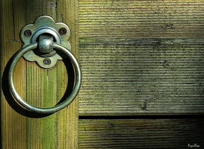 Keywords: door front door house entrance input goal wood pattern metal fitting frame door handle ring metal antique handle shiny rosette stainless steel grain wood grain capping entry garden door wooden door closed close up close