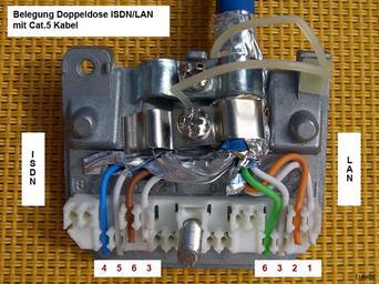 MAKE A MEME View Large Image Doppelbelegung mit Cat.5.jpg Die korrekte Doppelbelegung einer RJ45-Doppeldose mit Cat 5-Kabel zum gleichzeitigen Anschluss von LAN und ISDN 2007-07-18 own assumed Luke84 ISDN Ethernet cables Insulation displacement connectors