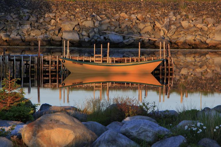 Keywords: dory boat water ocean sea rowboat wooden coast nautical shore harbor reflection summer tranquil maritime moored calm rowing