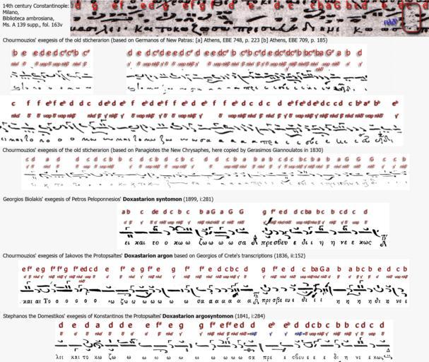 Keywords: Doxastikon oktoechon Thearchio nevmati.png en Various transcriptions exegeseis of the traditional sticheron Doxastikon oktoechon Θεαρχίῳ νεύματι 1 Milan Biblioteca ambrosiana Cod A 139 supp fol 163v 2 Athens National Library EBE MPT 748 p 223 3 Athens National Library EBE MPT 709 p 185 4 Petros Peloponnesios the Lampadarios 1899 Το Δοξαστάριον Πέτρου Πελο οννησίου; εξηγηθέν ιστώς εκ της αρχαίας εις την καθ ημάς γραφήν υ ό του Πρωτοψάλτου της εγάλης του Χριστού Εκκλησίας Γεωργίου Βιολάκη transcr from the old notation by Georgios Biolakis in collaboration with Konstantinos Klavvas and Iakovos Nafpliotis 2 vol Istanbul publisher of the patriarchate i 281 5 Iakovos the Protopsaltes 1836 Δοξαστάριον εριέχον τα δοξαστικά όλων των δεσ οτικών και θεομητορικών εορτών των τε εορταζομένων αγίων του όλου ενιαυτού του τε Τριωδίου και Πεντηκοσταρίου μελο οιηθέν αρά Ιακώβου Πρωτοψάλτου της του Χριστού εγάλης Εκκλησίας Εξηγηθέν α αραλλάκτως εις την έαν της ουσικής έθοδον αρά Χουρμουσίου Χαρτοφυλακός transcr and ed by Georgios of Crete Chourmouzios the Chartophylakos 2 vol Istanbul Isak De Castro ii 152 6 Konstantinos the Protopsaltes 1841 Δοξαστάριον εριέχον τα δοξαστικά όλων των δεσ οτικών και θεομητορικών εορτών των τε εορταζομένων αγίων του όλου ενιαυτού του τε Τριωδίου και Πεντηκοσταρίου μελο οιηθέν αρά Κωνσταντίνου Πρωτοψάλτου της του Χριστού εγάλης Εκκλησίας Εξηγηθέν α αραλλάκτως εις την έαν της ουσικής έθοδον αρά ρώτου Δομεστίχου Στεφάνου transcr and ed by Stephanos the Domestikos 2 vol Istanbul Patriarchate i 284 Platonykiss annotation 2012-09-11 PD-Old PD-US-unpublished Byzantine music Song books 14th-century manuscripts 19th-century manuscripts Neumes Petros Peloponnesios |