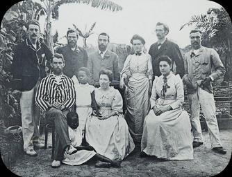Keywords: Dr Harry Guinness on Congo, Congo, 1891 (IMP-CSCNWW33-OS9-8).jpg en <br> Dr Harry Guinness on Congo Congo 1891 Black and white lantern slide featuring a small group of missionaries from the Congo Balolo Mission in 1891 The group comprises nine smartly dressed men and women One woman sits and holds the hand of a Congolese girl dressed in a smart white dress and another Congolese girl sits at the feet of Mr Cole wearing a striped blazer Women wear smart floor length Edwardian dreses whilst men wear trousers with blazers Palms can be seen behind the group and they are pictured in front of fencing made of branches The photograph was taken by Dr Harry Guinness and from left to right the group comprises Back row Dr Harry Guinness dark jacket with light trim and hand on hip ; Mr Howell; Mr Luff; Mrs McKittrick; Mr McKittrick; Mr Gibson Front row Mr Cole; Mrs Cole; and Miss De Hailes This slide comes from a collection generated by missionaries working for the Congo Balolo Mission a mission begun in 1889 under the supervision of the East London Training Institute for Home and Foreign Missions that developed into the interdenominational evangelical mission Regions Beyond Missionary Union after 1900 Photographer Unknown Subject personal name Guinness H Grattan Henry Grattan 1861-1915; McKittrick John d 1891 Filename IMP-CSCNWW33-OS9-8 tif Coverage date 1891/1910 Subject unesco Clergy Part of collection International Mission Photography Archive ca 1860-ca 1960 Part of subcollection Photographs from the Centre for the Study of World Christianity University of Edinburgh U K ca 1900-ca 1940s Subject corporate name Congo Balolo Mission Repository name Centre for the Study of World Christianity Archival file Volume2/IMP-CSCNWW33-OS9-8 tif Repository address The University of Edinburgh School of Divinity New College Mound Place Edinburgh EH1 2LX United Kingdom Geographic subject country Congo Format aacr2 lantern slides 8 2 x 8 2cm Geographic subject continent Africa Rights Contact the repository for details Part of series Regions Beyond Missionary Union Slides of Congo Missionaries CSCNWW33-OS9 Repository email divinity-CSWC ed ac uk Date created 1891/1910 Publisher of the digital version University of Southern California Libraries Subject aat genre group portraits Format aat lantern slides; photographs Access conditions http //www ed ac uk/schools-departments/divinity/research/centres/world-christianity/collections-resources File CSCNWW33/OS9/8 Contributor W C Hughes 82 Mortimer Road Kingsland Road London Subject lcsh Missionaries; Portraits group 1891/1910 date created author http //digitallibrary usc edu/cdm/ref/collection/p15799coll123/id/78013 PD-old-70-1923 Congo-Balolo Mission Missionaries Missionaries from the United Kingdom Congo-Balolo Magic lantern images Images from USC Digital Library uploaded by Fæ International Mission Photography Archive ca 1860-ca 1960 |