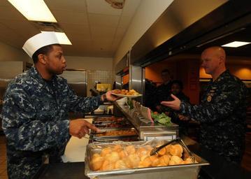 | Keywords: Dr. Martin Luther King Jr. memorial day in Norfolk DVIDS362444.jpg en Petty Officer 3rd Class Justin Allen culinary specialist serves Naval Station Norfolk Command Master Chief David B Carter at the base galley during a commemorative meal for Dr Martin Luther King Jr During a program honoring King diversity committee members from Naval Station Norfolk enacted skits depicting the civil rights movement and Rev Joyce Nyhaug spoke about King's achievements and the importance of keeping 'the dream' alive 2011-01-28 U S Navy photo by Petty Officer 3rd Class Stuart Phillips https //www dvidshub net/image/362444 110128-N-+++++-111 2011-02-01 17 52 NORFOLK VA US PD-USGov-Military-Navy Naval Station Norfolk Images from DoD uploaded by Fæ |