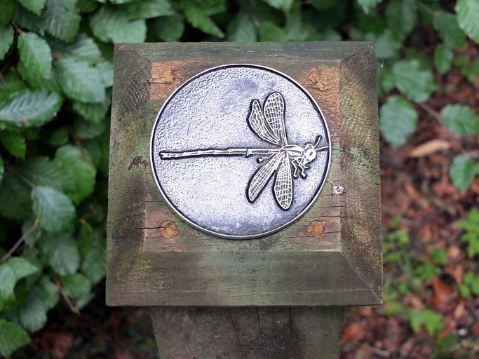 Keywords: dragonfly guide garden path direction metal steel embossed wings body nature leaves chlorophyll decoration park design imprint