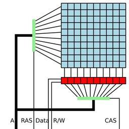 Keywords: DRAM.svg Organization of a semiconductor Dynamic RAM DRAM chip Each bit of data is stored a memory cell The cells blue blocks are laid out in an array of rows and columns on the chip The memory address applied to the chip A is broken into two parts; a row address which is decoded by a row address decoder green rectangle left to select one row of cells and a column address which is decoded by a column address decoder green rectangle bottom to select one of the cells in the active row When the Row Address Strobe RAS line is asserted the row of memory cells is activated transferring the bit of data in each cell to the sense amplifiers red blocks When the Column Address Strobe CAS line is asserted the column address decoder picks the bit from one column to output on the Data line <br /> The write process is similar except that the Read/Write R/W line is asserted so instead of reading a bit a bit of data on the Data line is written by the selected sense amplifier into the memory cell Own 2008-03-05 HandigeHarry PD ImageNote 1 189 7 205 206 400 400 2 Memory cells ImageNoteEnd 1 ImageNote 2 91 46 26 124 400 400 2 Row address decoder ImageNoteEnd 2 ImageNote 3 182 228 216 44 400 400 2 Sense amplifiers ImageNoteEnd 3 ImageNote 4 231 291 121 27 400 400 2 Column address decoder ImageNoteEnd 4 DRAM 10x10 arrays