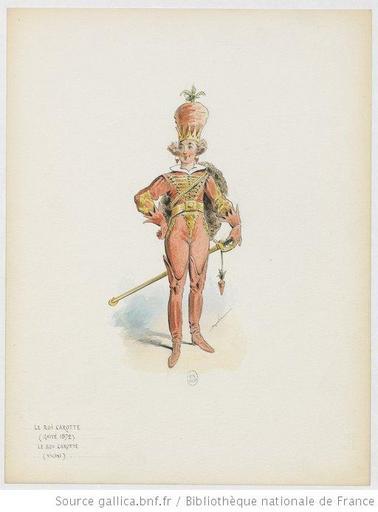 Keywords: Draner - Costume du Roi Carotte - 1872.jpeg Artwork Un personnage vêtu de orange et jaune en pied content de lui se tient face à l ™observateur Le poing droit à la hanche son autre main repose sur un sabre qui lui bat les talons Cette arme est rendue ridicule car au pommeau pend un gland sous forme de carotte Ce même légume pend à chacune de ses cuissardes et en boucles d ™oreille La couronne témoigne du titre et elle ceint une incroyable mitre faite d ™une très haute carotte 1872 Technique aquarelle color Size cm 24 31 Institution Bibliothèque nationale de France 4-OICOTHE-78 71 object history exhibition history credit line ark /12148/btv1b550034867 in black in draw ~ in black in black supperposé fr Selon la Bibliothèque nationale de France BnF cette oeuvre est pour l ™Ã©dition sans nom sans lieu Il n ™existe pas sur le document mis en ligne par la BnF de date de création d ™impression ou d ™Ã©dition Le titre attribué par la BnF est Le Roi Carotte opéra-bouffe de Victorien Sardou Vicini Roi Carotte dessin / de Draner See below / Voir ci-dessous accession number PD-Art Uploaded with UploadWizard Victorien Sardou Operas by Offenbach Draner Carrots in art |