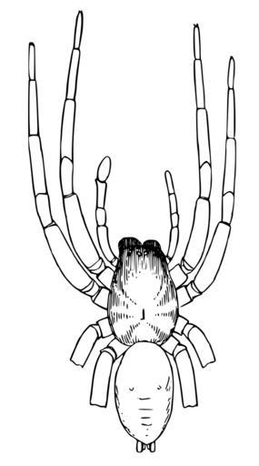 | Keywords: Drassodes.saccatus.mosaic.-.emerton.svg <br> Collected August 10 1906; general appearance of old female of large size with the abdomen shrivelled as in a female that has laid eggs The epigynum is complete and symmetrical as in a normal female The cephalothorax and abdomen are symmetrical and the 3rd and 4th legs are alike on both sides The right palpus is that of a female and the left that of a male with the palpal organ fully developed The 1st and 2nd legs of the left side are slightly longer than those of the right side the left mandible is thicker than the right and the claw slightly longer but the mandible is not elongated nor narrowed at the tip as it is in the male Kulczynski described in 1885 an Erigone fusca <small>Blackwall</small> now Oedothorax fuscus or Oreoneta brunnea with right female + left male side Epigynum was developed only on the right asymmetry extended to cephalothorax abdomen and spinnerets the legs however were symmetrical in length only difference being in those of the 1st pair which had the right tarsus like the female and the left like the male Psyche 14 40 1907 Creator James Henry Emerton 1930 Gynandromorphs Spider anatomy Drawings of animals by James H Emerton SVG anatomy Drassodes saccatus |