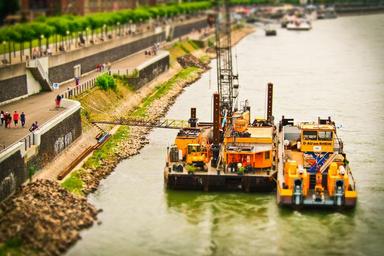 Keywords: dredgers excavators pebble excavator buckets water construction vehicle port sand construction machine water site backhoe bucket dredger fairway deepening expansion rhine düsseldorf river riverside work tilt shift wet bagger