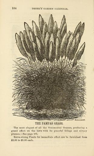 | Keywords: Dreer's garden calendar 1872 (16385957457).jpg 104 <br> dreer's garden calendar <br> THE PAMPAS GEASS <br> The most elegant of all the Ornamental Grasses producing a <br> grand effect on the lawn with its graceful foliage and silvery <br> plumes ” See page 105 <br> Extra-strong Plants for immediate effect can be furnished from <br> §2 00 to 5 00 each 42725937 136349 68310 Page 104 Text http //www biodiversitylibrary org/page/42725937 1872 10 1080/03745480109442904 Henry A Dreer Firm ; Henry G Gilbert Nursery and Seed Trade Catalog Collection Biodiversity Heritage Library Dreer's garden calendar 1872 Garden Stories Catalogs Fruit Gardening Henry A Dreer Firm Nursery stock Seeds U S Department of Agriculture National Agricultural Library bhl page 42725937 dc identifier http //biodiversitylibrary org/page/42725937 bhlGardenStories Pampas grass BHLinbloom henry a dreer firm u s department of agriculture national agricultural library bhlgardenstories bhlinbloom Information field Flickr posted date ISOdate 2015-02-18 CC-BY-2 0 BioDivLibrary https //flickr com/photos/61021753 N02/16385957457 2015-08-24 02 52 20 cc-by-2 0 PD-old-70-1923 Dreer's garden calendar Dreer's garden calendar 1872 Photos uploaded from Flickr by Fæ using a script |