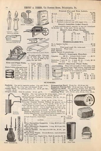 | Keywords: Dreer's quarterly wholesale price list (16544587006).jpg 54 <br> HENEY A DREER 714 Chestnut Street Philadelphia Pa <br> ASPA HAOUS BUNCHES <br> The Van Keyper Glazing Point <br> No righ ts or lefts Price per <br> box of 1000 60c; by mail <br> 75c ; in lots of 5000 by ex- <br> press 55c per 1000 <br> Tree and Plant Tubs <br> Painted Green <br> Madeof white cedar and bonnd <br> with extra iron <br> hoops Drop- <br> handles serving <br> as hooks for carry <br> poles Iron legs <br> j Removable per- <br> forated bottoms <br> No <br> 1 <br> 2 <br> 3 <br> 4 <br> 5 <br> 6 <br> 7 <br> Outside Length <br> Diam of Stave <br> 27 in 24 in <br> 25 <br> 23 <br> 21 <br> 19 <br> 18 <br> 16 <br> 15 <br> 14 <br> 22 <br> 20 <br> 18 <br> 16 <br> 14 <br> 13 <br> 12 <br> 10 <br> Each <br> 4 75 <br> 4 25 <br> 3 60 <br> 3 25 <br> 2 75 <br> 2 50 <br> 2 00 <br> 1 75 <br> 1 50 <br> Painted Pot and Tree Labels <br> Per 1000 Per 1000 <br> 60 6 inch 1 25 <br> 65 8 2 50 <br> 70 10 3 50 <br> 90 12 4 50 <br> Notched or pierced tree 60 <br> Notched or pierced tree with copper wire 1 00 <br> Dreer's Indelible Label Pencil <br> A black indelible pencil superior to any yet introduced <br> for florists' use 5 cts each ; 50 cts per doz <br> Dreer's Iron Plant Stands <br> Inches Galvanized <br> high Plain or Bronzed <br> 15 45 cts each 55 cts each <br> 18 55 70 <br> 24 77 1 00 <br> 30 80 1 15 <br> '36 90 1 40 ˘' <br> WHEELBARROWS <br> No 4 Eastern Garden 3 50 <br> No 5 4 00 <br> With broad tread 25e extra each <br> Canal Barrows Wood body 2 00 <br> Boys' Barrows 2 00 <br> Special Narrow for greenhouse 3 00 <br> Dreer's Asparagus Buncher <br> Complete 2 00 ; without Knife Guard 1 75 <br> Dreer's Pruning Shears <br> Perfection 7 inch 1 75 ; 8 inch 2 00 ; 9 inch 2 25 <br> German 8 inch 75 ; 9 inch 1 00 <br> Dreer's Keystone Plant Tubs <br> These tubs are made of white cedar with <br> strong hoops fixed bottom unpainted and <br> drop-handles They are durable and neat <br> A good tub at a moderate price <br> Outside Length of <br> Diam Stave Each Doz <br> No 12 13 13 0 75 8 25 <br> 15 16 16 1 25 13 50 <br> KeSe tub 18 20 19 - 2 00 22 00 <br> SUNDRIES <br> Baskets For use in vegetable garden bu oak 50 cts <br> 1 bu oak 60 cts ; 1 bu oak iron-bound 75 cts <br> Jersey Peat For potting plants etc 1 25 per bbl <br> 5 bbls 5 00 <br> Oregon Peat <br> Only for orchids 10 cts per lb <br> Raphia The best material for tying plants vines etc <br> Per lb 18 cts ; 10 lbs 1 65 ; 100 lbs 15 00 <br> White Cotton Twine for Pot herbs Per lb 20 cts ; <br> 10 lbs 1 75 <br> Celery Twine 5-ply 16 cts per lb ; 5 lbs 75 cts <br> Two-ply Coarse Cotton Twine for general use in <br> tying Beets Carrots etc 16 cts per lb ; 5 lbs 75 cts <br> Jute Twine for tying Plants or Vegetables 12 cts per <br> lb ; 100 lbs 11 00 Can be supplied in 2 3 and 4 ply <br> Silkaline for smilax and asparagus Spool 20c ; lb 1 25 <br> Mastica A substitute for putty 1 25 cts per gal <br> Mastica Machine For applying mastica 1 00 each <br> Putty Distributor For applying putty or mastica 75c <br> Wire Sieves ” Any size mesh <br> Propagating Sand 50 per bu ; 1 00 per bbl <br> Prepared Potting Soil 50 cts per bus ; 1 00 per bbl <br> Sphagnum Moss For growing orchids and packing <br> plants and trees etc 1 25 per bbl ; 2 00 per bale <br> Grafting Wax J lb 10 cts ; lb 15 cts ; 1 lb 25 cts <br> fCQ <br> M <br> 20-inch diameter extra heavy 0 65 CA I0V <br> Putty Dmtributob <br> 18 50 <br> 20 medium 45 <br> 18 40 <br> Wire Carnation Supports <br> 27 50 per 1000 <br> Wire Carnation Supports <br> 30 00 per 1000 <br> Tobacco Stems Per bale of of 250 lbs <br> ton 12 00 <br> Wood Pulp Vases For cut-flowers ; neat attractive <br> and water-proof <br> No 0 Diam 8 in Depth 13 in Each 40 per doz 4 35 <br> 1 5 10 35 3 80 <br> 2 4 9 30 3 25 <br> 3 4 6 25 2 75 <br> 4 3 4 20 2 20 <br> Support <br> Tobacco Stems <br> 2 ring 3 00 per 100; <br> 3 ring 3 50 per 100; <br> 1 50; per <br> Wire Sieves 43769166 148724 77605 Page 54 Text http //www biodiversitylibrary org/page/43769166 1900 10 5962/bhl title 77605 Henry A Dreer Firm ; Henry G Gilbert Nursery and Seed Trade Catalog Collection NameFound Aspa NameConfirmed Aspa EOLID 4849763 NameBankID 2999055 NameFound Asparagus NameConfirmed Asparagus var pygmaeus Makino EOLID 10487111 NameFound Sphagnum NameConfirmed Sphagnum L EOLID 47595 Biodiversity Heritage Library Dreer's quarterly wholesale price list tools fertilizers insecticides sundries etc Garden Stories Bulbs Plants Catalogs Flowers Nurseries Horticulture Seeds Vegetables U S Department of Agriculture National Agricultural Library bhl page 43769166 dc identifier http //biodiversitylibrary org/page/43769166 bhlGardenStories Henry A Dreer Garden Tools BHLinbloom bulbs plants nurseries horticulture u s department of agriculture national agricultural library bhlgardenstories henry a dreer garden tools bhlinbloom Information field Flickr posted date ISOdate 2015-02-18 CC-BY-2 0 BioDivLibrary https //flickr com/photos/61021753 N02/16544587006 2015-08-24 22 52 03 cc-by-2 0 PD-old-70-1923 Dreer's quarterly wholesale price list Photos uploaded from Flickr by Fæ using a script |