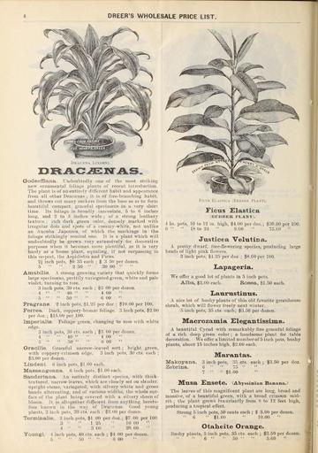 | Keywords: Dreer's wholesale price list (16166225413).jpg DREER'S WHOLESALE PRICE LIST <br> GodseflQana I'ndoubtedly one of the most striking <br> new ornamental Ibliagie plants of recent introduction <br> The plant is of an entirely ditiferent haV it and appearance <br> from all other Dracaenas ; it is of free-branching habit <br> and throws out many suckers from the base so as to form <br> beautiful compact graceful specimens in a very short <br> time Its foliage is broadly lanceolate 5 to 6 inches <br> long and 2 to 3 inches wide ; of a strong leathery <br> texture ; rich dark green color densely marked with <br> irregular dots and spots of a creamy-white not unlike <br> an Aucuba Japonica of which the markings in the <br> foliage strikingly remind one It is a plant which will <br> undoubtedly be grown very extensively for decorative <br> purposes when it becomes more plentiful as it is very <br> hardy as a house plant equaling if not surpassing in <br> this respect the Aspidistra and Ficus <br> 2j inch pots 0 35 each ; 3 50 per dozen <br> 5 2 50 30 00 <br> Amabllis A strong growing variety that quickly forms <br> large specimens prettily variegated green white and pale <br> violet turning to To se <br> 3 inch pots 30 cts each ; 3 00 per dozen <br> 4 40 4 00 <br> 5 50 6 00 <br> Fragrans 2 inch pots §1 25 per doz ; 10 00 per 100 <br> Ferrea Dark coppery-bronze foliage 3 inch pots 2 00 <br> per doz ; 15 00 per 100 <br> Imperialis Foliage green changing to rose with white <br> edge <br> 3 inch pots 30 cts each ; 3 00 per dozen <br> 4 40 4 00 <br> 5 50 6 00 <br> Gracilis Graceful narrow-leaved sort ; bright green <br> with coppery-crimson edge 3 inch pots 30 cts each ; <br> 3 00 per dozen <br> Lindeni 6 inch pots 1 00 each <br> Massangeana 6 inch pots 1 00 each <br> Sanderiana An entirely distinct species with thick- <br> textured narrow leaves which are closely set on slender <br> upright stems variegated with silvery wliite and green <br> bauds alternating and ol' various widtlis the wliole sur- <br> face of the plant being covered with a silvery sheen of <br> bloom It is allogetlier difTerent from anything hereto- <br> fore known in tlie way of Dracanas iood young <br> plants 3 inch pots 30 cts each ; 3 00 per dozen <br> Terminalis 2 inch pots 1 00 per doz ; 7 00 per 100 <br> 3 1 25 10 00 <br> 4 3 JO 20 00 <br> YouDgi 4 inch pots 40 cts each ; 4 00 per dozen <br> 5 50 6 00 <br> 1;ci;i;ki I'L XT <br> Ficus £lastica <br> KITUBEK PLANT <br> 4 in pots 10 to 12 in high 4 00 per doz ; 30 00 per 100 <br> 6 18 to 24 9 00 75 00 <br> Justice a Velutiua <br> A pretty dwarf free-flowering species producing large <br> heads of light pink flowers <br> 3 inch pots 1 25 per doz ; 8 00 per 100 <br> Lapageria <br> We ofier a good lot of plants in 5 inch pots <br> Alba 3 00 each Rosea 1 50 each <br> Liaurustinus <br> A nice lot of bushy plants of this old favorite greenhouse <br> shrub which will flower freely next winter <br> 5 inch pots 35 cts each; 3 50 per dozen <br> Macrozamia £legantissima <br> A beautiful Cycad with remarkably fine graceful foliage <br> of a rich deep green color ; a handsome plant for table <br> decoration We offer a limited number of 5 inch pots bushy <br> plants about 15 inches high 2 00 each <br> Makoyana <br> Zebrina <br> Marantas <br> 35 cts each <br> 3 inch pots <br> 6 75 <br> 7 1 00 <br> 3 50 per doz <br> lAnSa £nsete Abyssinian Banana <br> The leaves of this magnificent plant are long broad and <br> massive of a beautiful green with a broad crimson mid- <br> rib ; the plant grows luxuriantly from 8 to 12 feet high <br> producing a tropical effect <br> Strong 5 inch ots 50 cents each ; 5 00 per dozen <br> 6 1 00 10 00 <br> Otaheite Orange <br> I' ushy plants 5 inch pots 35 cts each ; 3 50 per dozen <br> 6 ' ¢ 50 5 00 45213739 161077 84662 Page 4 Text Summer Edition http //www biodiversitylibrary org/page/45213739 1899 Dreer Henry A Firm Biodiversity Heritage Library Dreer's wholesale price list / Garden Stories Bulbs Plants Catalogs Dreer Henry A Firm Nurseries Horticulture Nursery stock Pennsylvania Philadelphia Seed industry and trade Seeds Mertz Library The New York Botanical Garden bhl page 45213739 dc identifier http //biodiversitylibrary org/page/45213739 bhlGardenStories Flowers Dracaenas BHLinbloom bulbs plants dreer henry a firm nurseries horticulture mertz library the new york botanical garden bhlgardenstories bhlinbloom Information field Flickr posted date ISOdate 2015-03-11 CC-BY-2 0 BioDivLibrary https //flickr com/photos/61021753 N02/16166225413 2015-08-24 21 52 10 cc-by-2 0 PD-old-70-1923 1899 catalogs Dreer's wholesale price list Photos uploaded from Flickr by Fæ using a script |