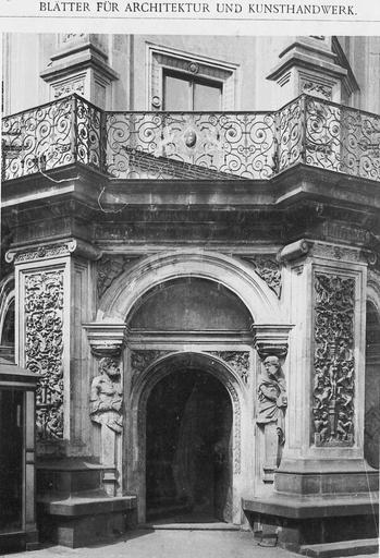 Keywords: Dresden, Schloss, nordwestlicher Treppenturm im Schlosshof, 2. Haupteingang, Kaspar Voigt von Wierandt (Baumeister) + Juan Maria Padovano genannt "il Mosca" (tätig um 1515-1530 in Padua und Venedig) und Bastian Stentz (Bildhauer).jpg de Dresden Blätter für Architektur und Kunsthandwerk 1904 author 1904 public domain PD-old Großer Schlosshof Dresden Giovanni Maria Padovano Blätter für Architektur und Kunsthandwerk |