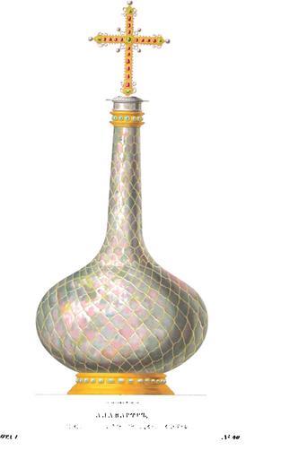 | Keywords: Drevnosti RG v1 ill041.jpg ru Д евности Российского госуда ства Antiquities of Russian country 1846 1853 Т 1 Иллюст ато Солнцев Фёдо Г иго ьевич Алаваст в кото ом х анится священное ми о Это узкого лый металлический сосуд пок ытый пе ламут овой чешуей с к естом наве ху из д агоценных камней Алаваст ом он назван с г еческого алебаст и сосуд из него для х анения а оматов По п еданию он п едставляет подобие того самого алаваст а из коего а ия агдалина излила д агоценное ми о на ноги Иисусовы как свидетельствует св евангелист а к XIV 3 В пе вые века усского х истианства алаваст с ми ом п ислан из Г еции в Киев откуда взят в оскву По д евнему обычаю п и таинственном освящении ми а в Успенском собо е в память общения нашей отечественной це кви с восточной п ибавляется из алаваст а в состав ми а несколько капель и пополняется новым чтобы никогда не иссякал сей священный источник 1846 1853 http //www runiverse ru/bookreader/book403605/ page/61/mode/1up Солнцев Фёдо Г иго ьевич <gallery>File Alavastr 16-17 c Kremlin museum by shakko 02 jpg</gallery> PD-Art Mother of pearl objects Chrism objects in Patriarchal residence Antiquities of Russian country - Volume I Files uploaded by Shakko from various sources Uploaded with UploadWizard |